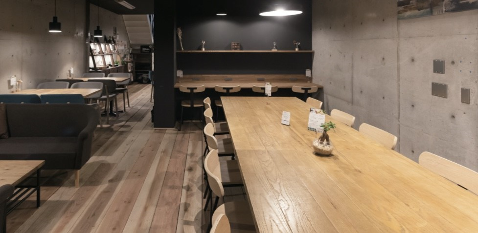 店内は落ち着いた空間を楽しめるよう照明や空間がデザインされている。フリーWiFi、各席に電源コンセントを完備し、ビジネスにも利用しやすい。