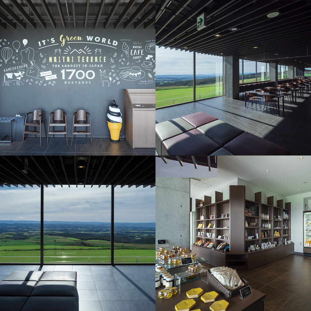 日本一広い公共牧場『ナイタイ高原牧場』の頂上に立つテラスカフェです。前面ガラス窓の展望カフェで、景色と共に味わうメニューが楽しめます。日差しに配慮した日かげテラスも設置されています。
